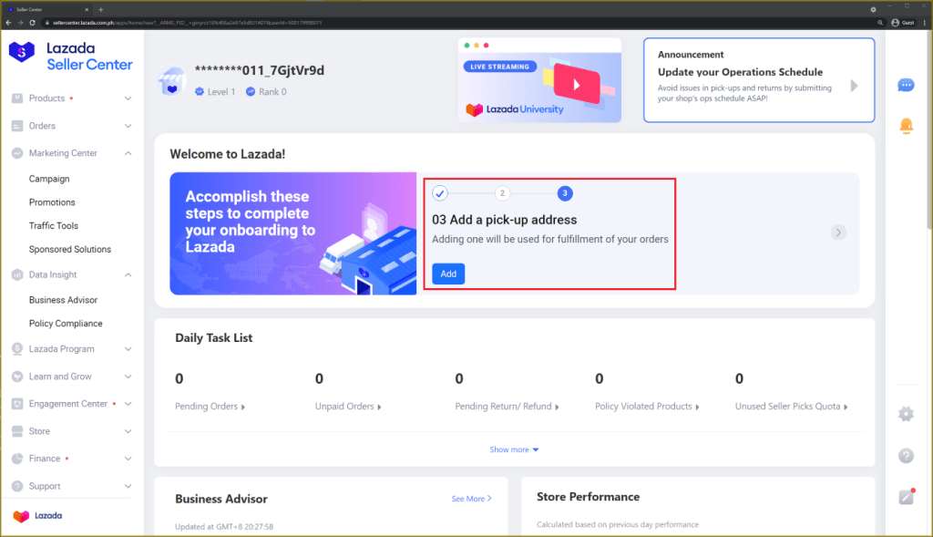 Now you can log in to Lazada Seller Center, nice! The next step is to set your warehouse address. Just click the third step on the banner: