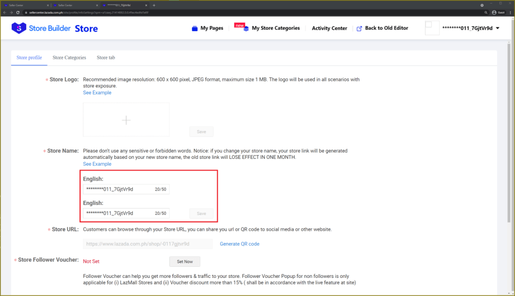 Clicking this will open a new tab, and here you will be able to update your store name and also upload your store logo if it is available: