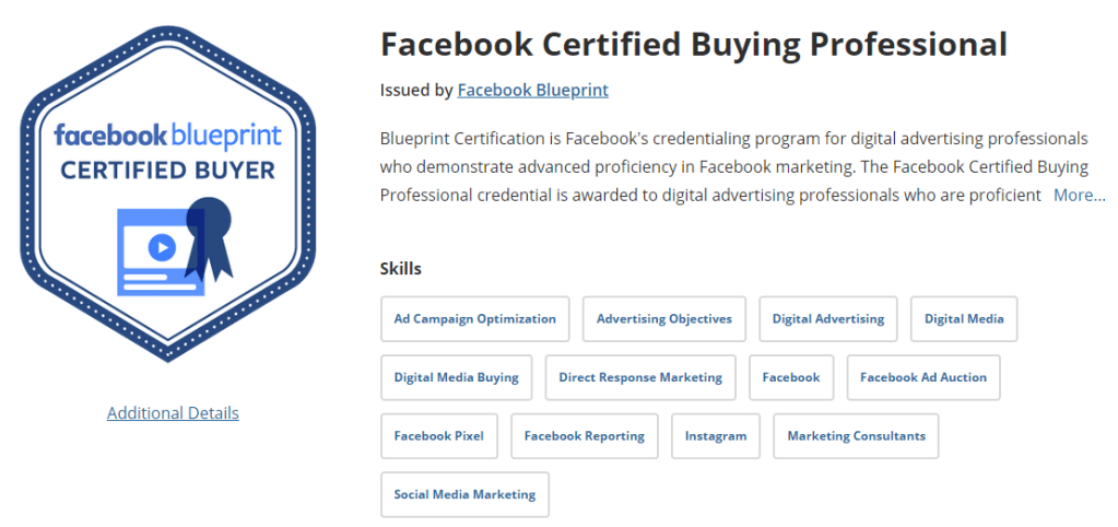 These certifications are directly acquired from Facebook, which allows individuals to showcase advanced level of proficiency on Facebook, Instagram and Messenger. Passing both exams would require extensive knowledge of the platform, from the strategy planning to campaign optimization to reporting.