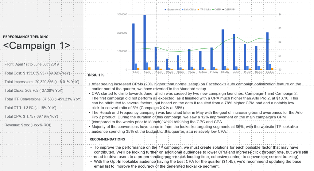 Using the detailed reports, we were able to evaluate performance with the clients and make sure all actions are aligned to improve on our campaign objective. This includes data that is broken down to several details, to give the client more info on what worked best, and also has suggestions on how to further improve the performance. Here’s a sample report:
