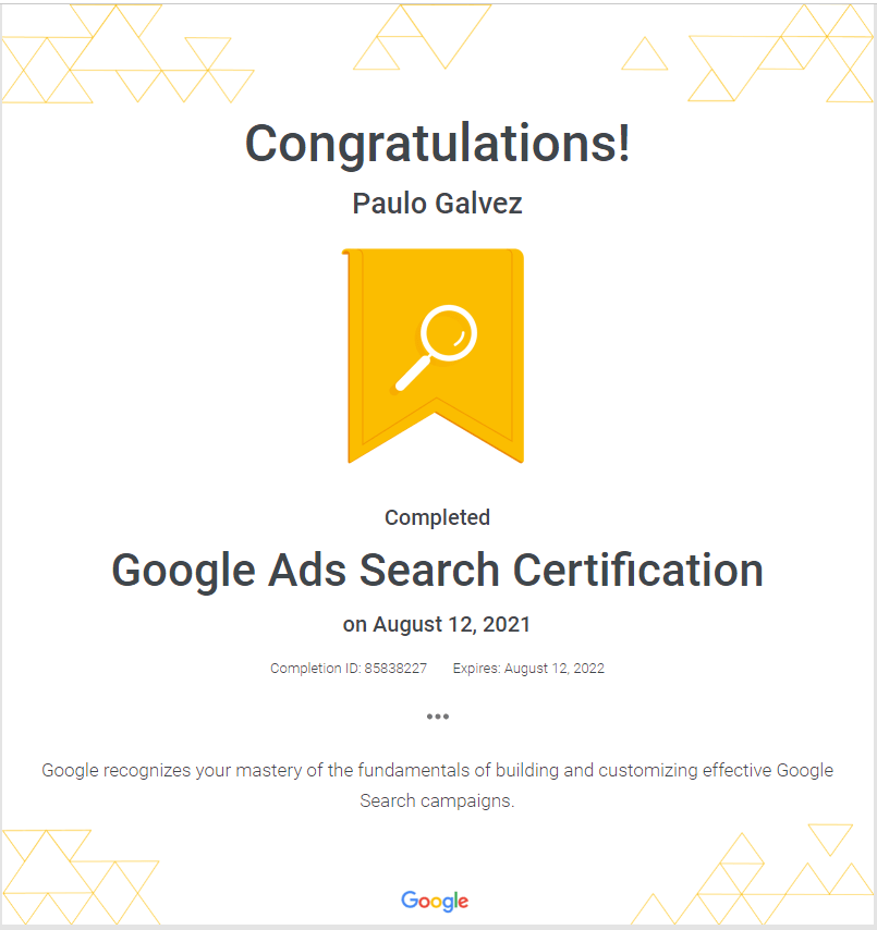 As the online advertising industry evolves continuously, I realize it is more important now than ever to expand my skills onto other advertising platforms. I have enrolled myself on Google Ads courses, and aim to be certified on all ad categories as soon as possible.