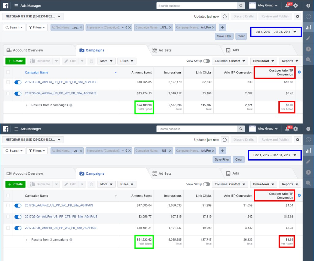 I was assigned to take over management for Netgear, the biggest client of the company spend-wise. The campaign in discussion is Arlo Pro, one of its the major product lines The transition started around July, and by August I started to fully manage the account. Since then we were able to see continuous improvements each month, and by December we achieved the record-low cost per conversion for the account, a 5.2x improvement margin in less than half a year.