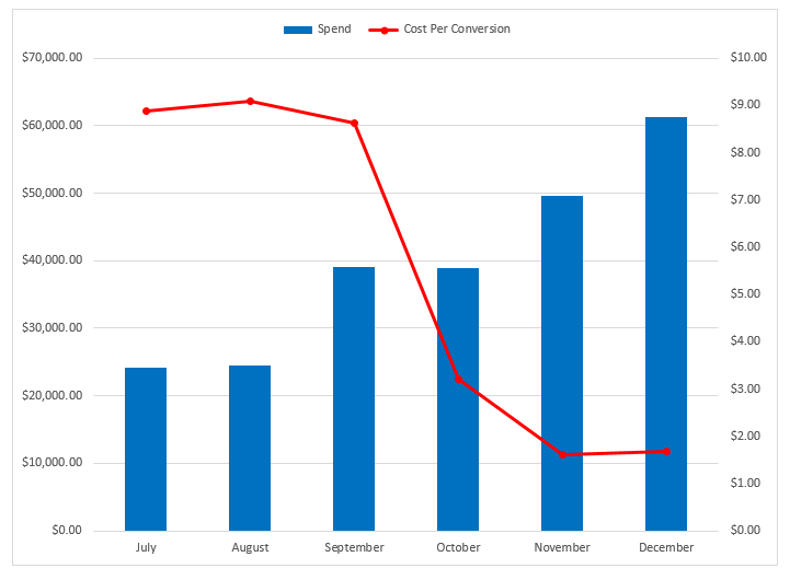 Needless to say, the client was highly satisfied with the success of the account, and we were able to scale our quarterly budgets from $120,000 to $200,000 for the following quarters.